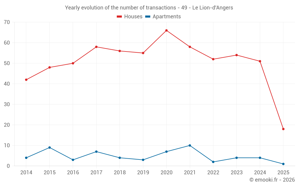 The median price on the 18 house transactions of the last 6 months in the municipality of Le Lion-d'Angers was 2 172 € per square meter for a median property value of 195 000 €. Over this period, 60% of transactions were between 1 733 and 2 606 € per square meter (from the 2nd to the 8th deciles).