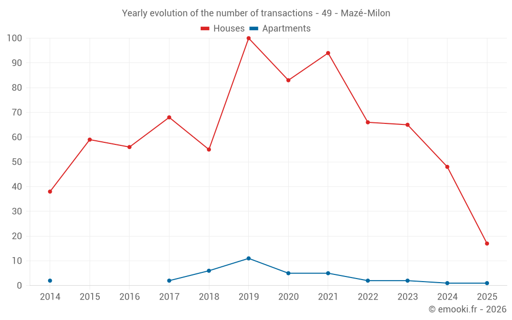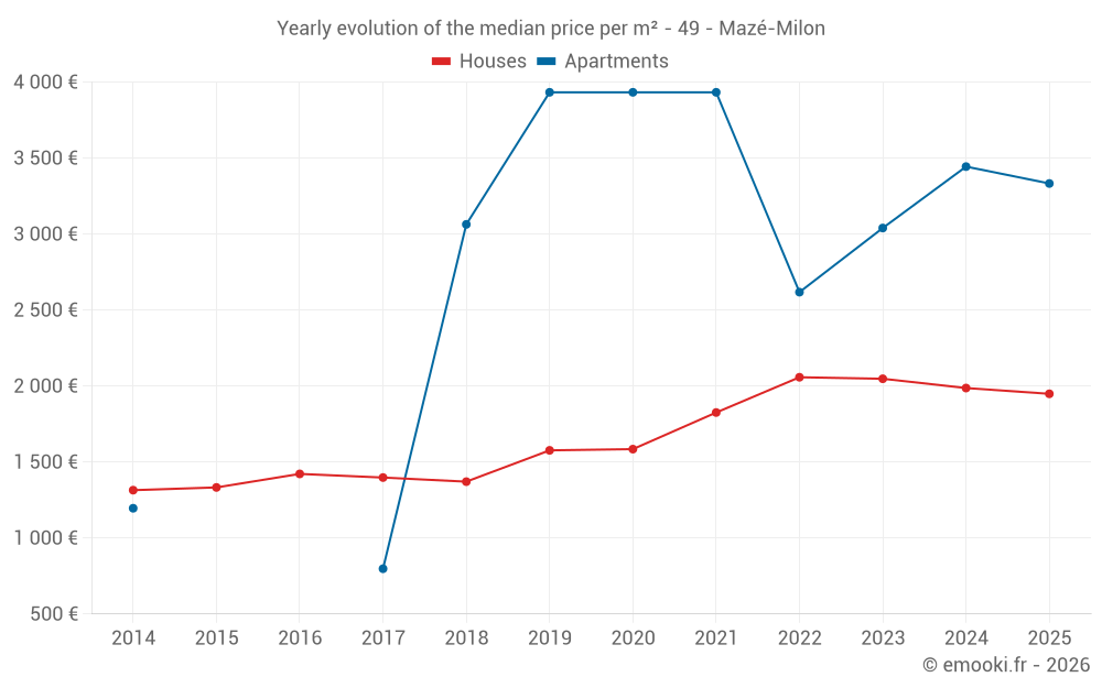 The median price on the 43 house transactions of the last 12 months in the municipality of Mazé-Milon was 1 905 € per square meter for a median property value of 215 000 €. Over this period, 60% of transactions were between 1 346 and 2 376 € per square meter (from the 2nd to the 8th deciles).