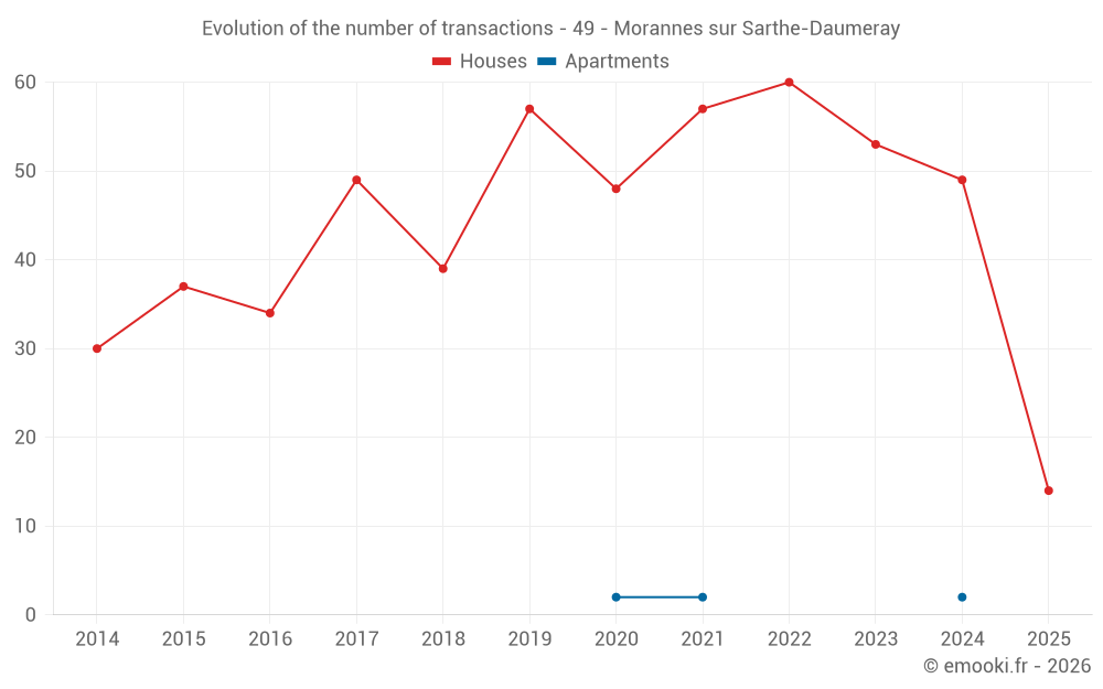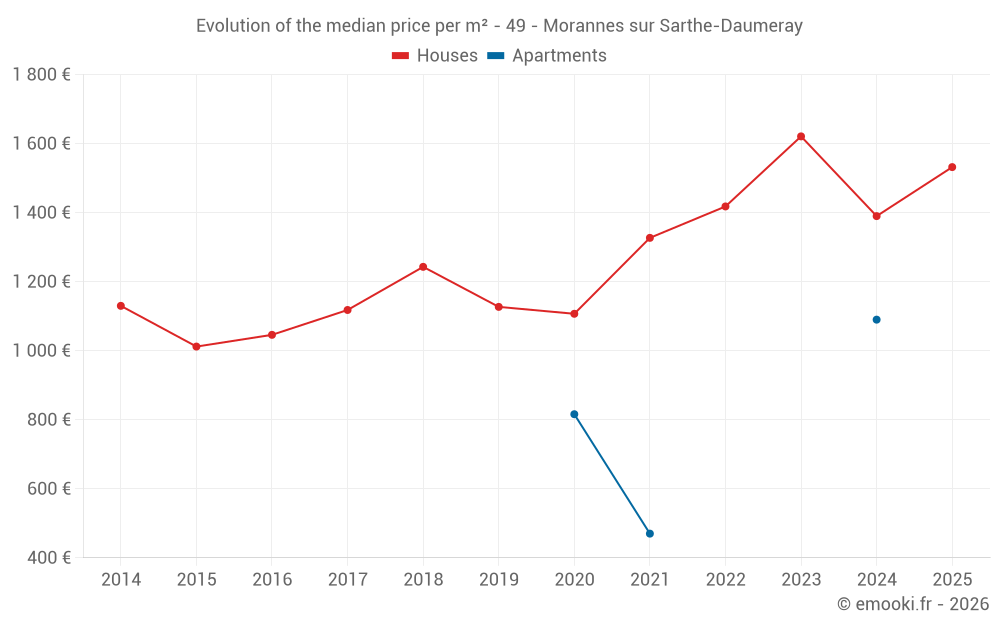 The median price on the 40 house transactions of the last 12 months in the municipality of Morannes sur Sarthe-Daumeray was 1 436 € per square meter for a median property value of 143 750 €. Over this period, 60% of transactions were between 862 and 1 798 € per square meter (from the 2nd to the 8th deciles).