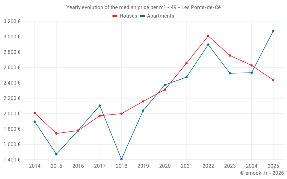 The median price on the 31 house transactions of the last 6 months in the municipality of Les Ponts-de-Cé was 2 438 € per square meter for a median property value of 257 000 €. Over this period, 60% of transactions were between 2 059 and 3 067 € per square meter (from the 2nd to the 8th deciles).
