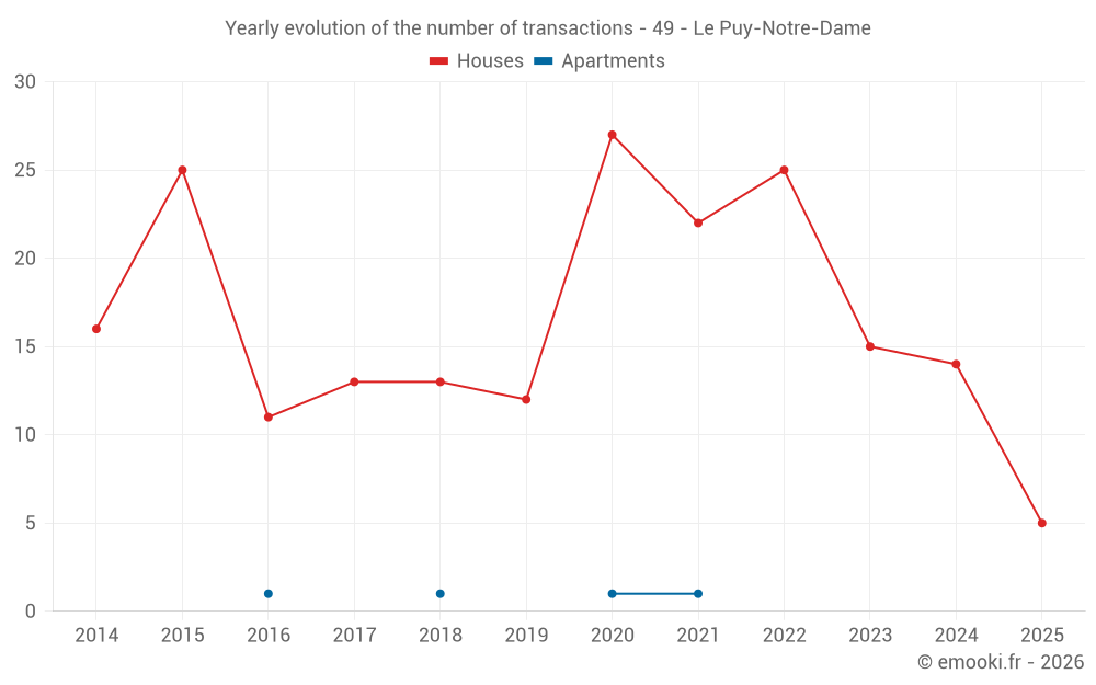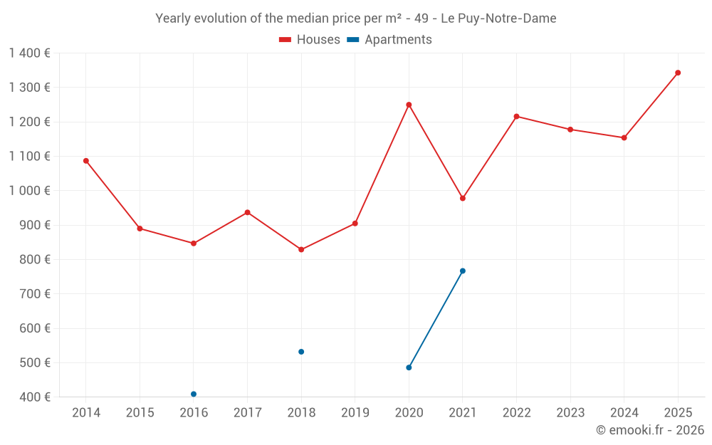 The median price on the 25 house transactions of the last 24 months in the municipality of Le Puy-Notre-Dame was 1 266 € per square meter for a median property value of 129 000 €. Over this period, 60% of transactions were between 740 and 1 629 € per square meter (from the 2nd to the 8th deciles).