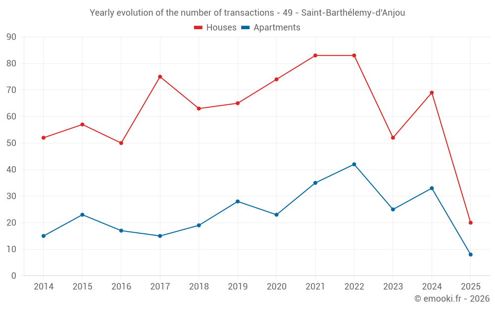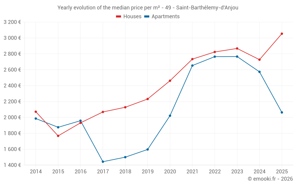 The median price on the 20 house transactions of the last 6 months in the municipality of Saint-Barthélemy-d'Anjou was 3 054 € per square meter for a median property value of 310 000 €. Over this period, 60% of transactions were between 2 609 and 3 376 € per square meter (from the 2nd to the 8th deciles).