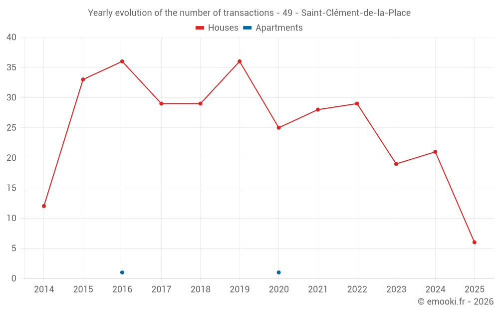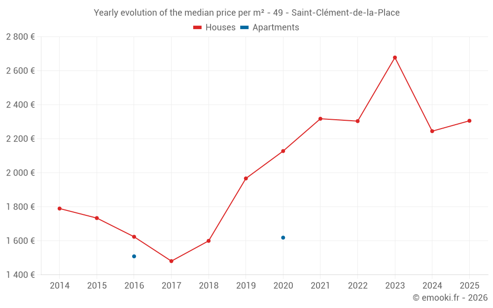 The median price on the 20 house transactions of the last 12 months in the municipality of Saint-Clément-de-la-Place was 2 266 € per square meter for a median property value of 290 000 €. Over this period, 60% of transactions were between 2 009 and 2 669 € per square meter (from the 2nd to the 8th deciles).