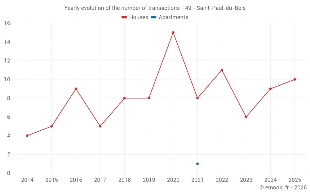 The median price on the 19 house transactions of the last 24 months in the municipality of Saint-Paul-du-Bois was 986 € per square meter for a median property value of 110 000 €. Over this period, 60% of transactions were between 658 and 1 302 € per square meter (from the 2nd to the 8th deciles).
