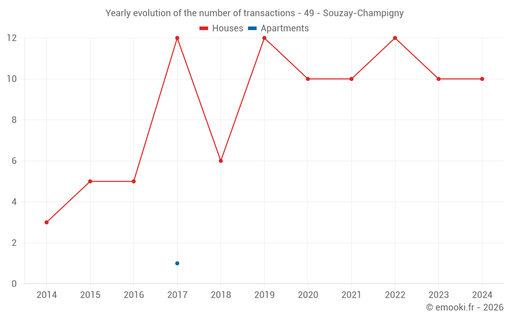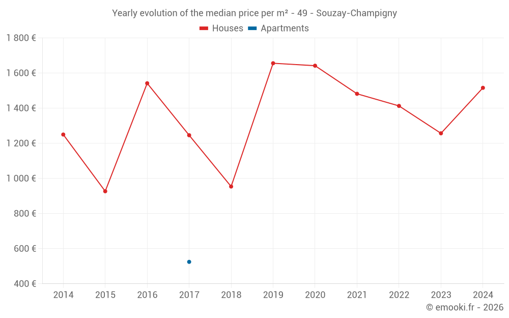 The median price on the 17 house transactions of the last 24 months in the municipality of Souzay-Champigny was 1 300 € per square meter for a median property value of 156 000 €. Over this period, 60% of transactions were between 1 011 and 2 330 € per square meter (from the 2nd to the 8th deciles).