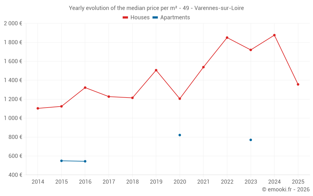 The median price on the 20 house transactions of the last 12 months in the municipality of Varennes-sur-Loire was 1 796 € per square meter for a median property value of 166 000 €. Over this period, 60% of transactions were between 954 and 2 398 € per square meter (from the 2nd to the 8th deciles).