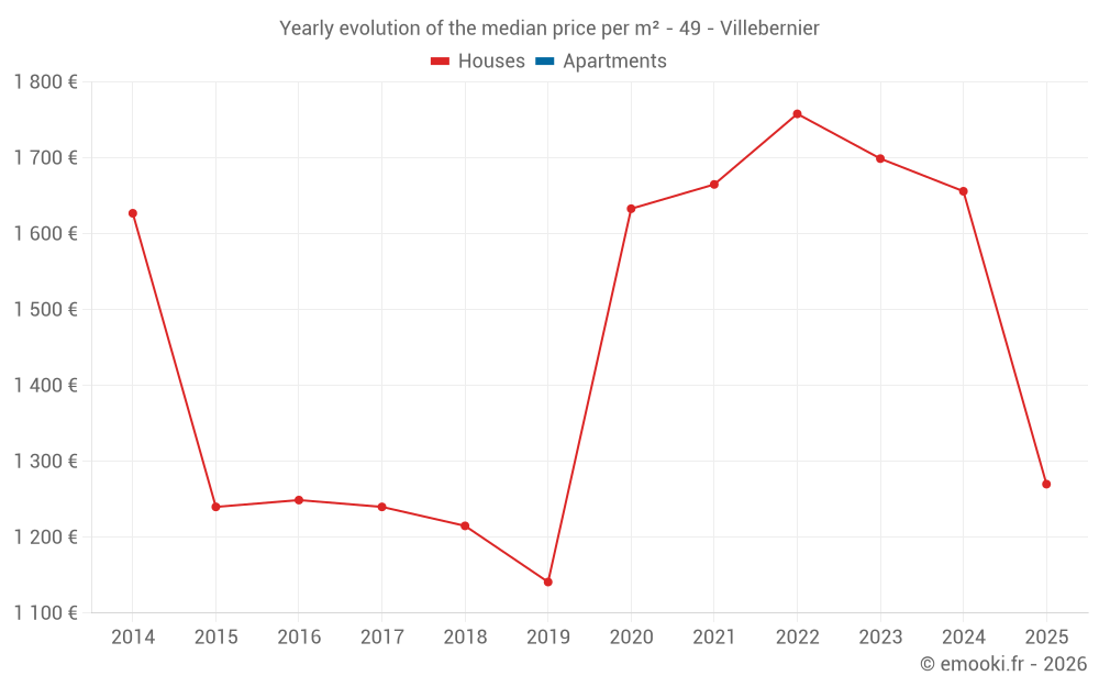 The median price on the 16 house transactions of the last 12 months in the municipality of Villebernier was 1 652 € per square meter for a median property value of 144 500 €. Over this period, 60% of transactions were between 891 and 2 164 € per square meter (from the 2nd to the 8th deciles).