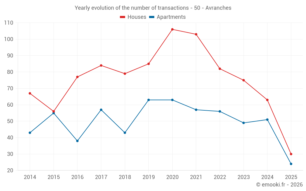 The median price on the 30 house transactions of the last 6 months in the municipality of Avranches was 2 416 € per square meter for a median property value of 249 500 €. Over this period, 60% of transactions were between 1 787 and 3 190 € per square meter (from the 2nd to the 8th deciles).