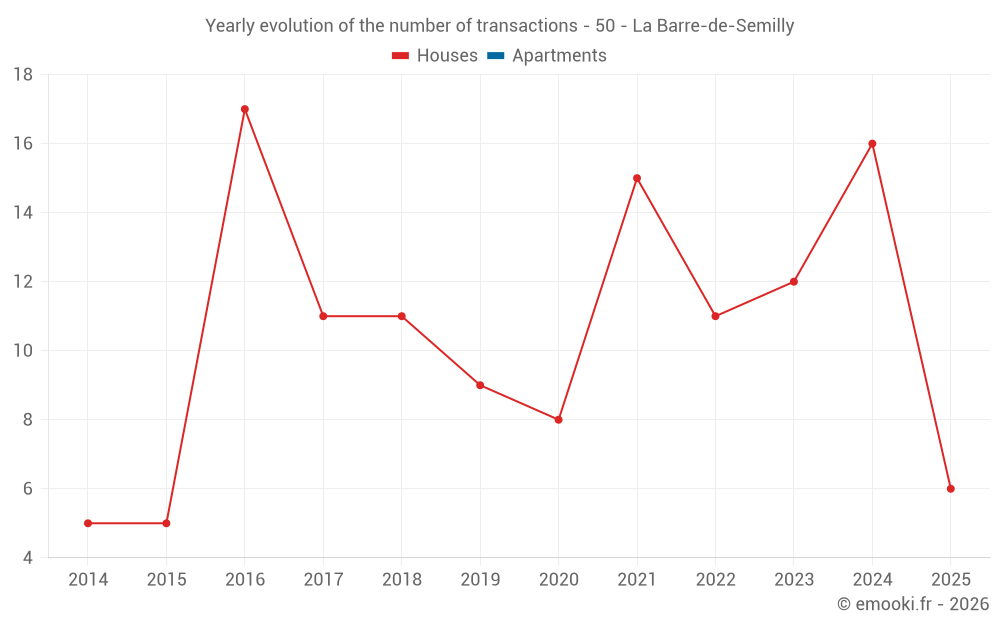 The median price on the 31 house transactions of the last 24 months in the municipality of La Barre-de-Semilly was 1 607 € per square meter for a median property value of 190 000 €. Over this period, 60% of transactions were between 1 397 and 1 975 € per square meter (from the 2nd to the 8th deciles).