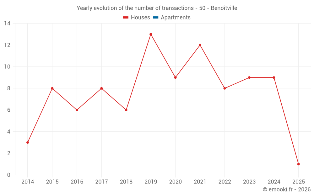 The median price on the 15 house transactions of the last 24 months in the municipality of Benoîtville was 1 963 € per square meter for a median property value of 170 000 €. Over this period, 60% of transactions were between 1 131 and 2 267 € per square meter (from the 2nd to the 8th deciles).
