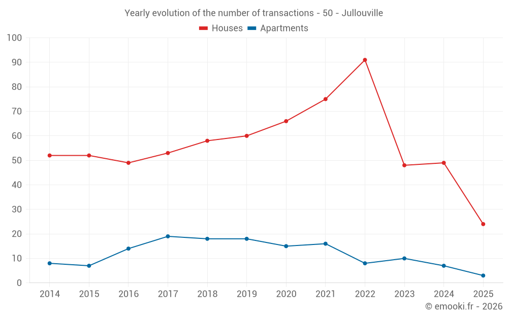 The median price on the 24 house transactions of the last 6 months in the municipality of Jullouville was 3 741 € per square meter for a median property value of 368 000 €. Over this period, 60% of transactions were between 2 889 and 6 166 € per square meter (from the 2nd to the 8th deciles).