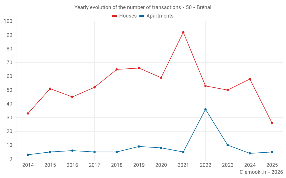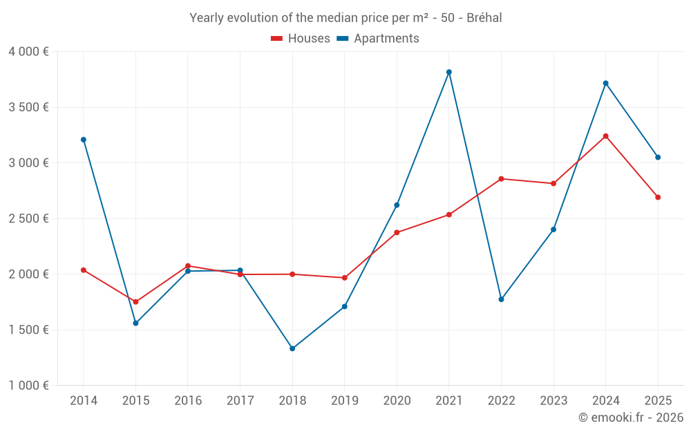 The median price on the 26 house transactions of the last 6 months in the municipality of Bréhal was 2 691 € per square meter for a median property value of 232 500 €. Over this period, 60% of transactions were between 1 933 and 3 476 € per square meter (from the 2nd to the 8th deciles).