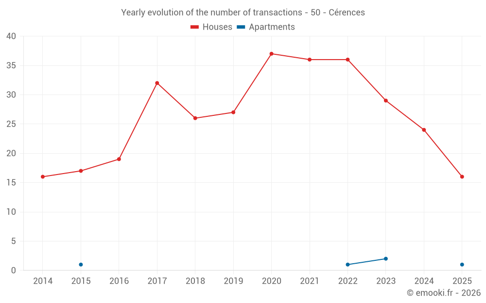 The median price on the 30 house transactions of the last 12 months in the municipality of Cérences was 1 639 € per square meter for a median property value of 153 000 €. Over this period, 60% of transactions were between 997 and 2 123 € per square meter (from the 2nd to the 8th deciles).