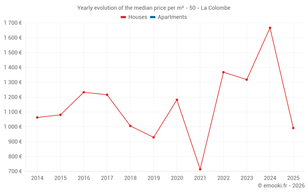 The median price on the 17 house transactions of the last 24 months in the municipality of La Colombe was 1 272 € per square meter for a median property value of 134 000 €. Over this period, 60% of transactions were between 914 and 1 954 € per square meter (from the 2nd to the 8th deciles).