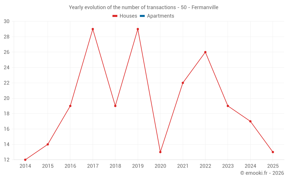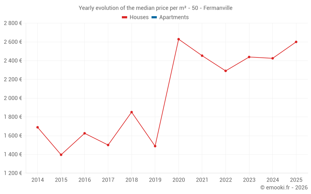 The median price on the 22 house transactions of the last 12 months in the municipality of Fermanville was 2 261 € per square meter for a median property value of 220 000 €. Over this period, 60% of transactions were between 1 845 and 2 941 € per square meter (from the 2nd to the 8th deciles).