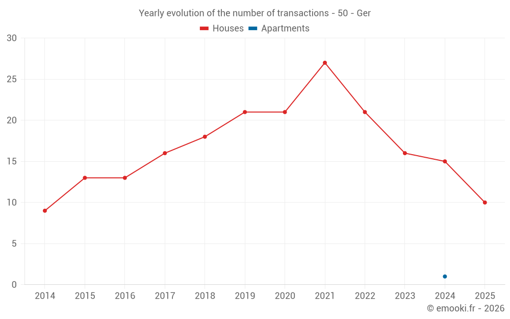 The median price on the 20 house transactions of the last 12 months in the municipality of Ger was 1 002 € per square meter for a median property value of 88 250 €. Over this period, 60% of transactions were between 383 and 1 584 € per square meter (from the 2nd to the 8th deciles).
