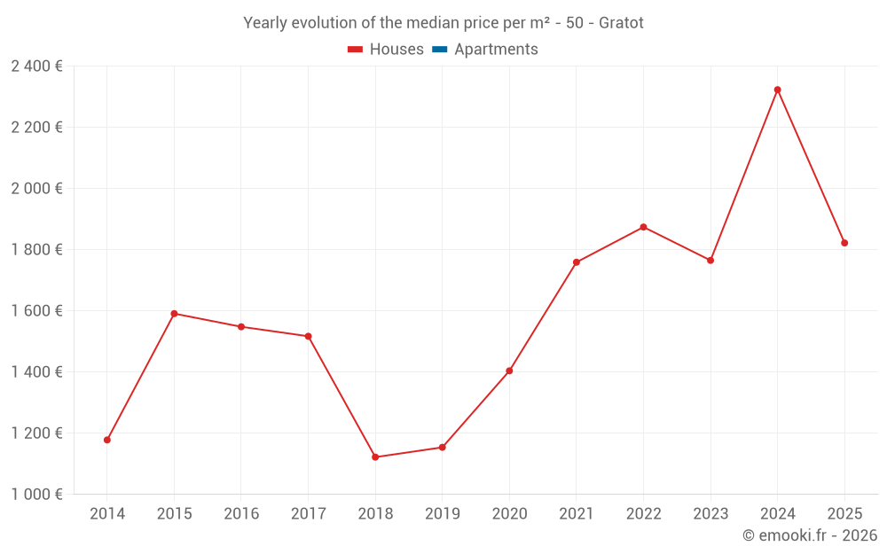The median price on the 17 house transactions of the last 24 months in the municipality of Gratot was 1 822 € per square meter for a median property value of 214 153 €. Over this period, 60% of transactions were between 1 062 and 2 392 € per square meter (from the 2nd to the 8th deciles).