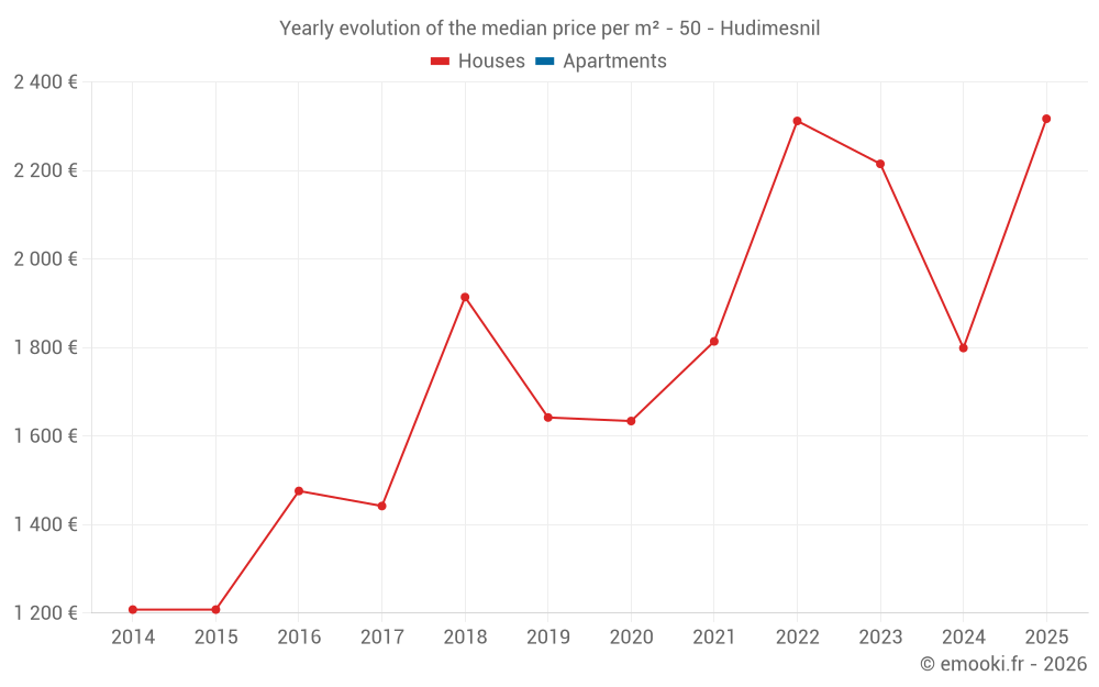 The median price on the 23 house transactions of the last 12 months in the municipality of Hudimesnil was 2 094 € per square meter for a median property value of 175 000 €. Over this period, 60% of transactions were between 1 310 and 2 844 € per square meter (from the 2nd to the 8th deciles).