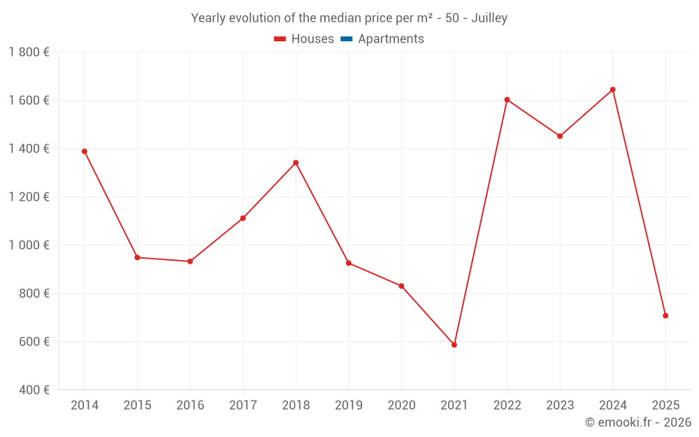 The median price on the 23 house transactions of the last 24 months in the municipality of Juilley was 1 452 € per square meter for a median property value of 165 000 €. Over this period, 60% of transactions were between 1 213 and 1 955 € per square meter (from the 2nd to the 8th deciles).
