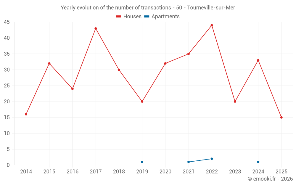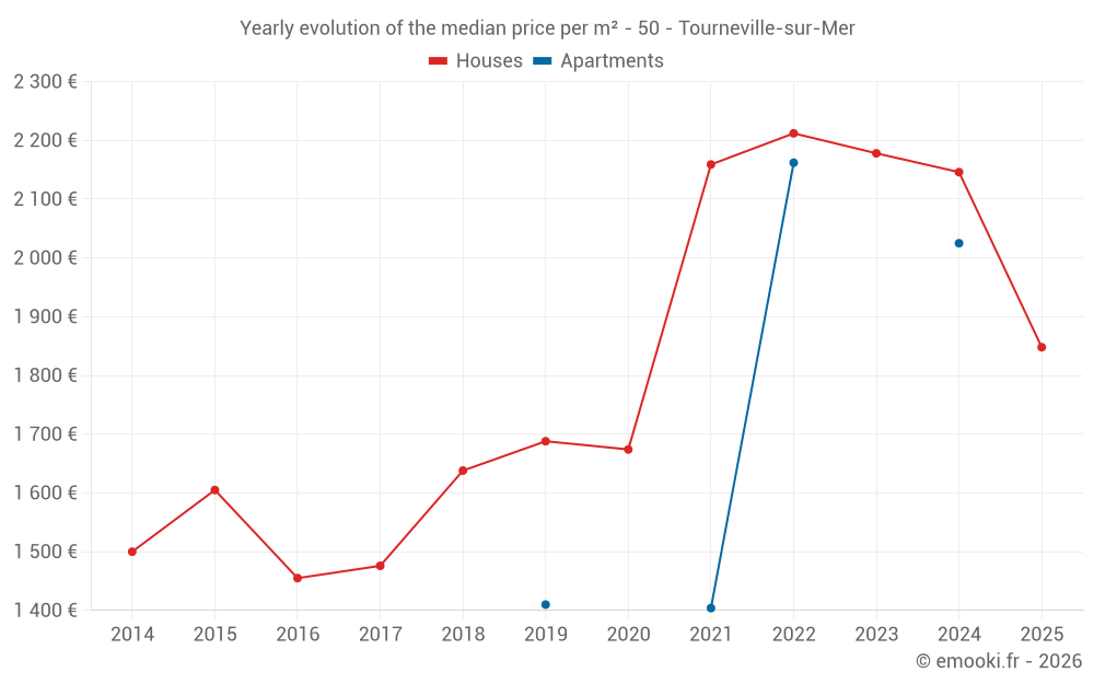 The median price on the 36 house transactions of the last 12 months in the municipality of Tourneville-sur-Mer was 2 064 € per square meter for a median property value of 189 144 €. Over this period, 60% of transactions were between 1 616 and 2 836 € per square meter (from the 2nd to the 8th deciles).