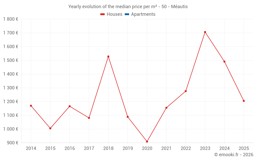 The median price on the 14 house transactions of the last 24 months in the municipality of Méautis was 1 480 € per square meter for a median property value of 147 500 €. Over this period, 60% of transactions were between 1 055 and 1 902 € per square meter (from the 2nd to the 8th deciles).