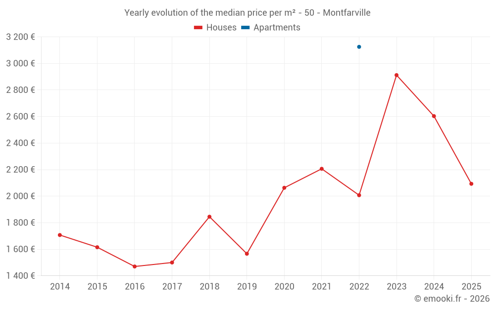 The median price on the 23 house transactions of the last 24 months in the municipality of Montfarville was 2 330 € per square meter for a median property value of 200 000 €. Over this period, 60% of transactions were between 1 702 and 3 037 € per square meter (from the 2nd to the 8th deciles).