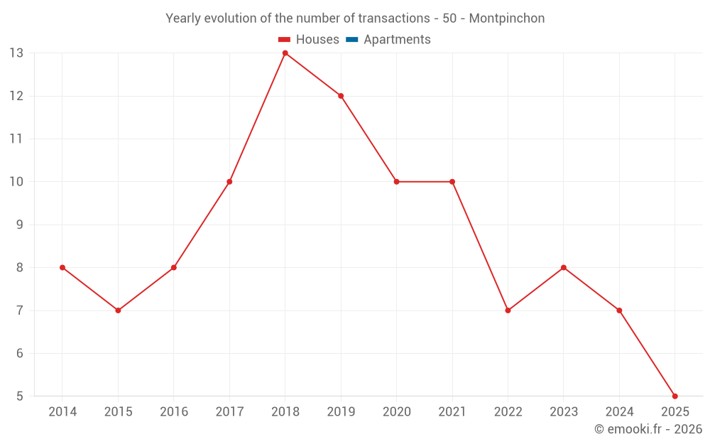 The median price on the 15 house transactions of the last 24 months in the municipality of Montpinchon was 1 714 € per square meter for a median property value of 144 000 €. Over this period, 60% of transactions were between 806 and 2 023 € per square meter (from the 2nd to the 8th deciles).