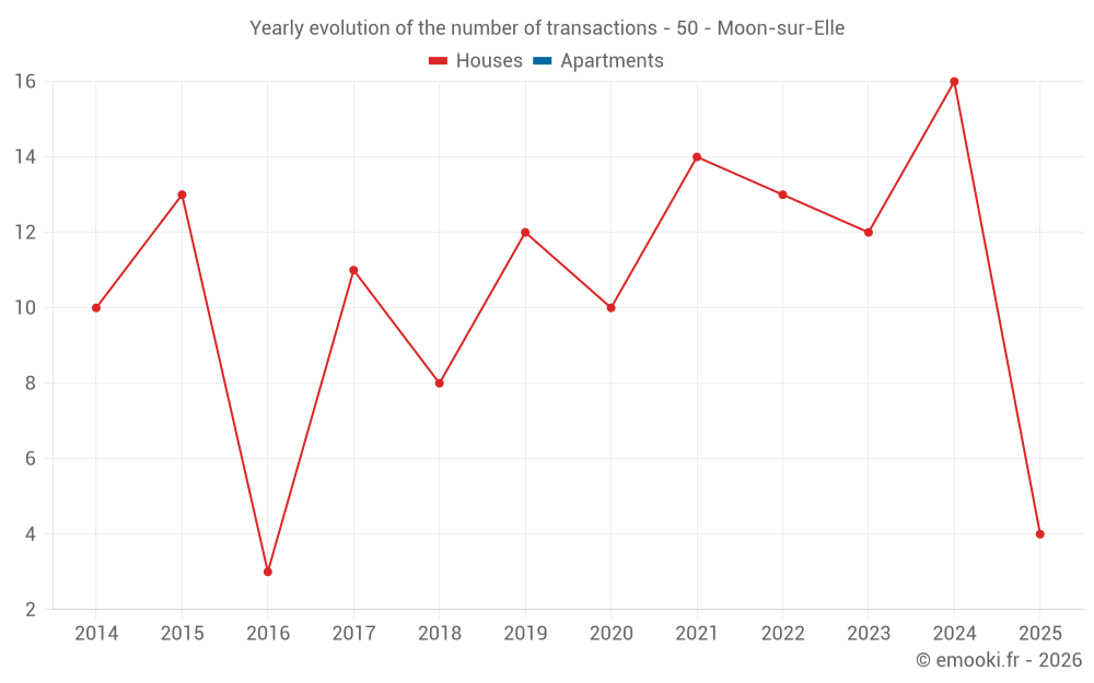 The median price on the 28 house transactions of the last 24 months in the municipality of Moon-sur-Elle was 1 530 € per square meter for a median property value of 165 000 €. Over this period, 60% of transactions were between 1 071 and 2 088 € per square meter (from the 2nd to the 8th deciles).
