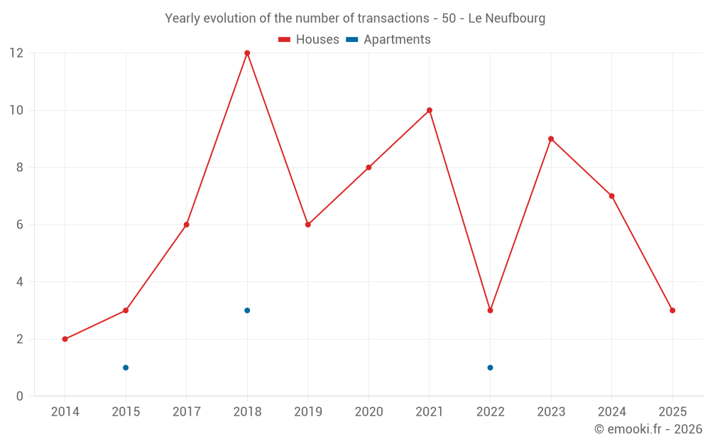 The median price on the 15 house transactions of the last 24 months in the municipality of Le Neufbourg was 1 050 € per square meter for a median property value of 81 000 €. Over this period, 60% of transactions were between 654 and 1 375 € per square meter (from the 2nd to the 8th deciles).
