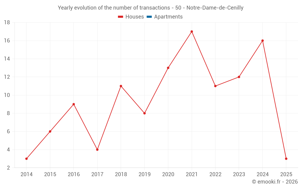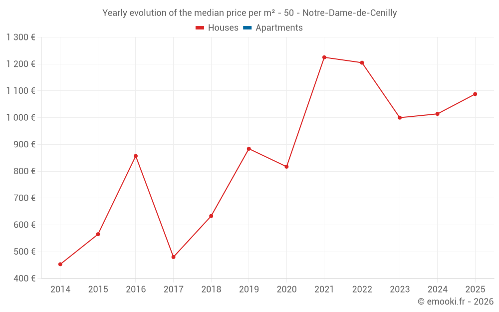 The median price on the 25 house transactions of the last 24 months in the municipality of Notre-Dame-de-Cenilly was 1 088 € per square meter for a median property value of 124 000 €. Over this period, 60% of transactions were between 874 and 1 526 € per square meter (from the 2nd to the 8th deciles).