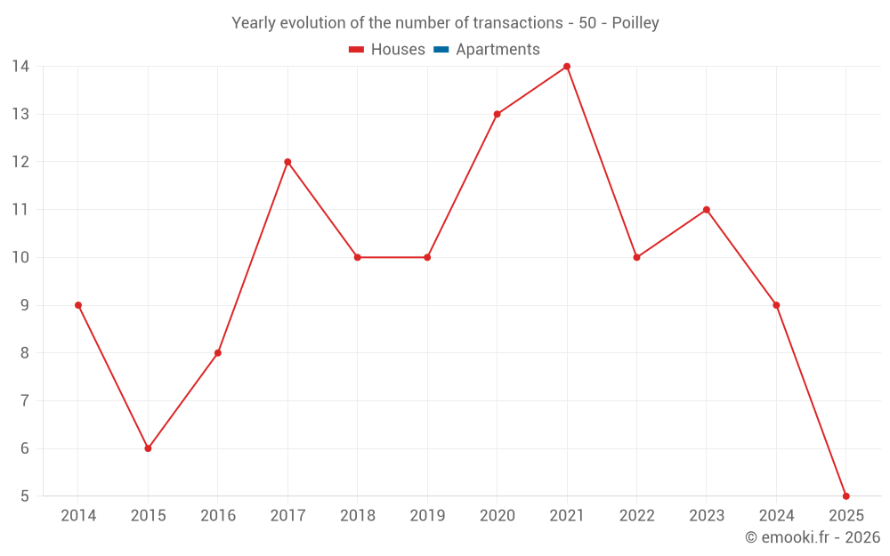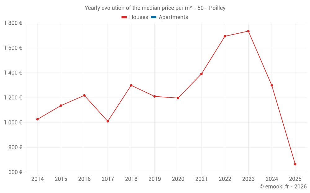 The median price on the 22 house transactions of the last 24 months in the municipality of Poilley was 1 584 € per square meter for a median property value of 153 500 €. Over this period, 60% of transactions were between 533 and 2 261 € per square meter (from the 2nd to the 8th deciles).
