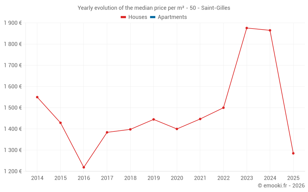 The median price on the 14 house transactions of the last 24 months in the municipality of Saint-Gilles was 1 848 € per square meter for a median property value of 196 650 €. Over this period, 60% of transactions were between 1 246 and 2 438 € per square meter (from the 2nd to the 8th deciles).