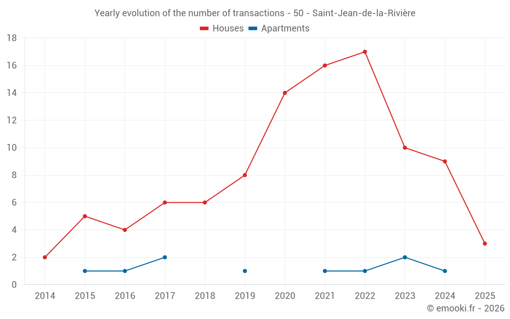 The median price on the 19 house transactions of the last 24 months in the municipality of Saint-Jean-de-la-Rivière was 2 743 € per square meter for a median property value of 238 800 €. Over this period, 60% of transactions were between 2 114 and 3 746 € per square meter (from the 2nd to the 8th deciles).