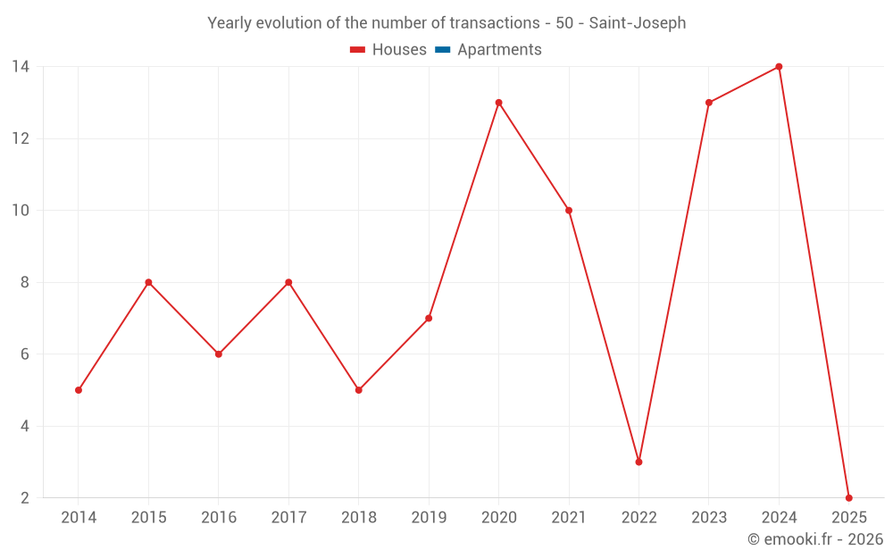 The median price on the 23 house transactions of the last 24 months in the municipality of Saint-Joseph was 1 650 € per square meter for a median property value of 168 000 €. Over this period, 60% of transactions were between 1 161 and 2 404 € per square meter (from the 2nd to the 8th deciles).