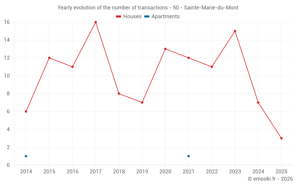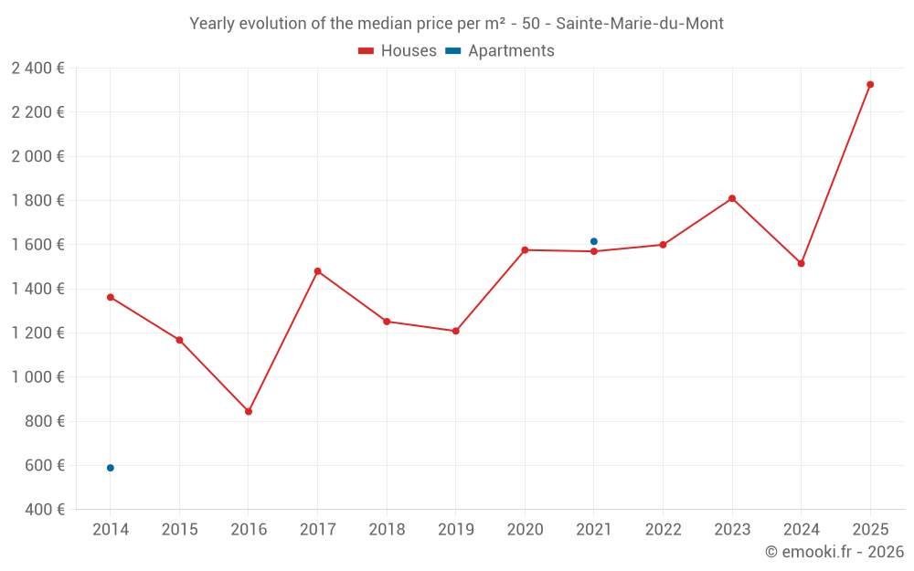 The median price on the 17 house transactions of the last 24 months in the municipality of Sainte-Marie-du-Mont was 1 839 € per square meter for a median property value of 153 000 €. Over this period, 60% of transactions were between 1 264 and 2 306 € per square meter (from the 2nd to the 8th deciles).