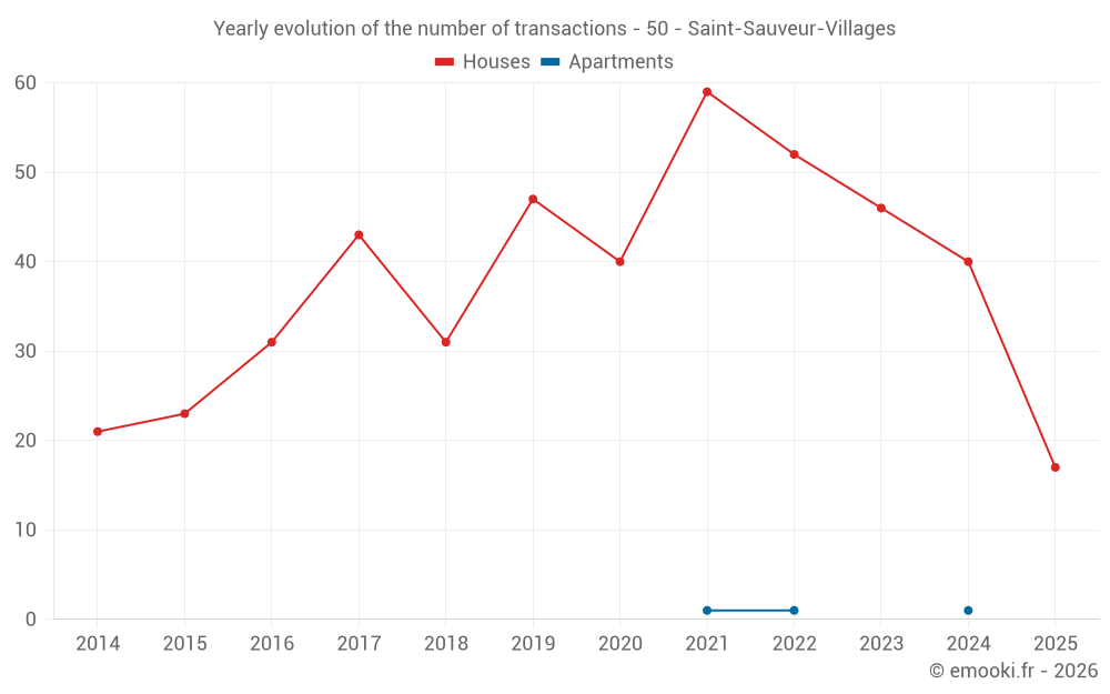 The median price on the 37 house transactions of the last 12 months in the municipality of Saint-Sauveur-Villages was 1 111 € per square meter for a median property value of 105 000 €. Over this period, 60% of transactions were between 591 and 1 584 € per square meter (from the 2nd to the 8th deciles).