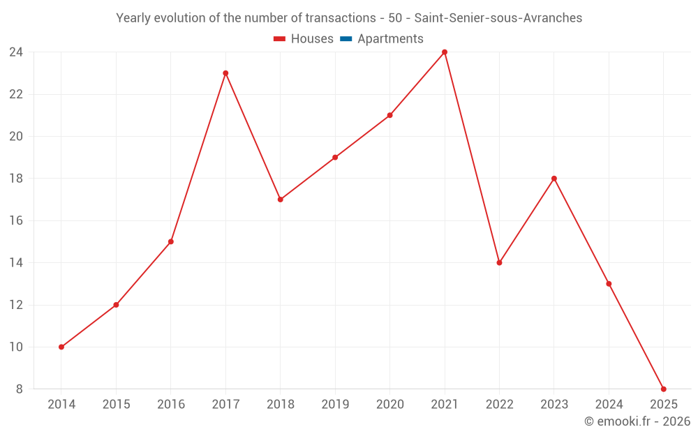 The median price on the 16 house transactions of the last 12 months in the municipality of Saint-Senier-sous-Avranches was 2 506 € per square meter for a median property value of 233 000 €. Over this period, 60% of transactions were between 1 857 and 3 067 € per square meter (from the 2nd to the 8th deciles).