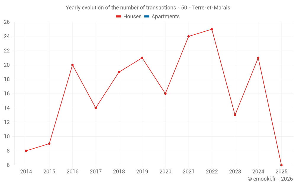 The median price on the 16 house transactions of the last 12 months in the municipality of Terre-et-Marais was 1 376 € per square meter for a median property value of 156 500 €. Over this period, 60% of transactions were between 885 and 1 738 € per square meter (from the 2nd to the 8th deciles).