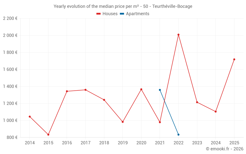 The median price on the 18 house transactions of the last 24 months in the municipality of Teurthéville-Bocage was 1 460 € per square meter for a median property value of 127 500 €. Over this period, 60% of transactions were between 1 102 and 2 374 € per square meter (from the 2nd to the 8th deciles).