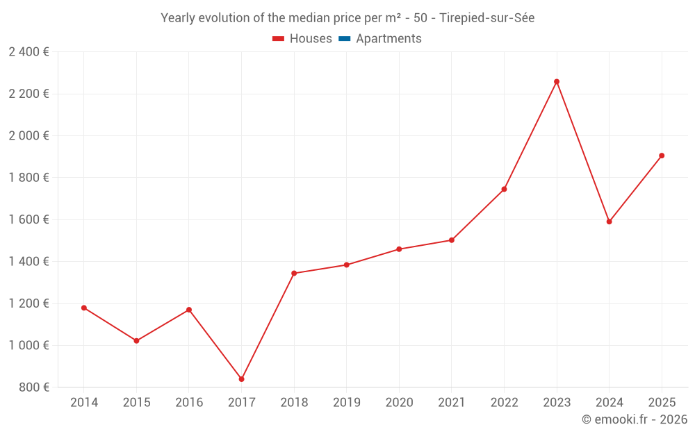 The median price on the 16 house transactions of the last 12 months in the municipality of Tirepied-sur-Sée was 1 878 € per square meter for a median property value of 157 800 €. Over this period, 60% of transactions were between 1 057 and 2 183 € per square meter (from the 2nd to the 8th deciles).
