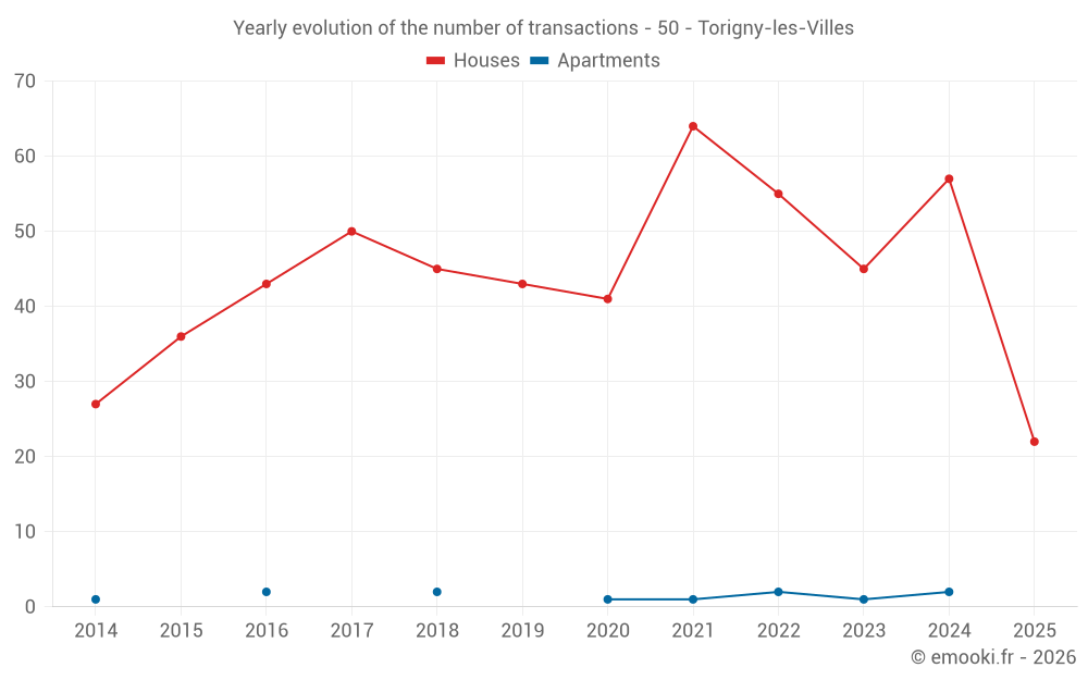 The median price on the 22 house transactions of the last 6 months in the municipality of Torigny-les-Villes was 1 322 € per square meter for a median property value of 171 000 €. Over this period, 60% of transactions were between 834 and 2 049 € per square meter (from the 2nd to the 8th deciles).
