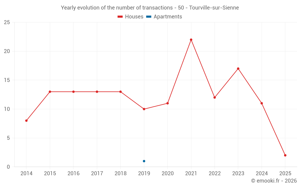 The median price on the 22 house transactions of the last 24 months in the municipality of Tourville-sur-Sienne was 2 442 € per square meter for a median property value of 281 000 €. Over this period, 60% of transactions were between 2 085 and 2 942 € per square meter (from the 2nd to the 8th deciles).