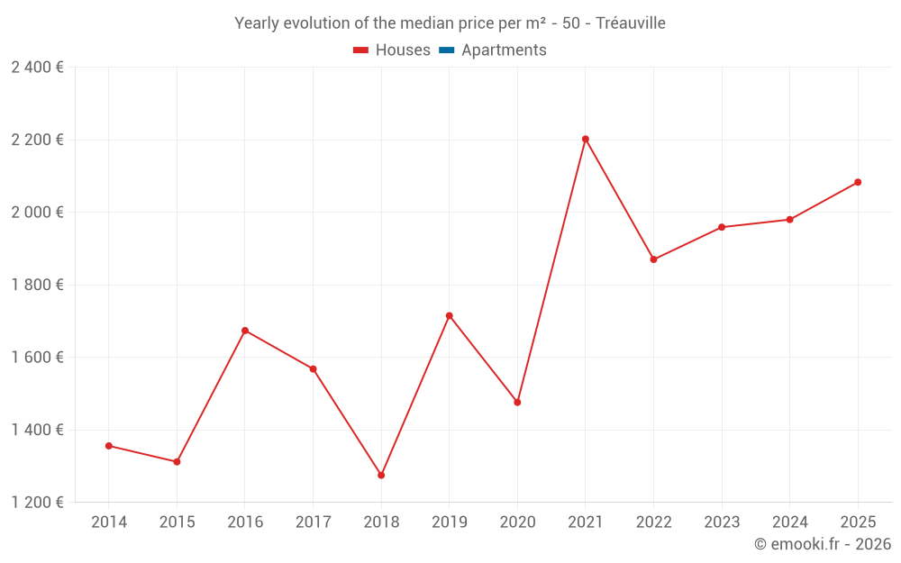 The median price on the 16 house transactions of the last 24 months in the municipality of Tréauville was 1 980 € per square meter for a median property value of 196 000 €. Over this period, 60% of transactions were between 1 400 and 2 371 € per square meter (from the 2nd to the 8th deciles).