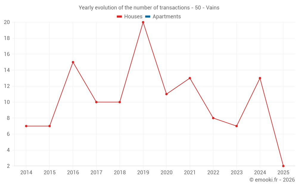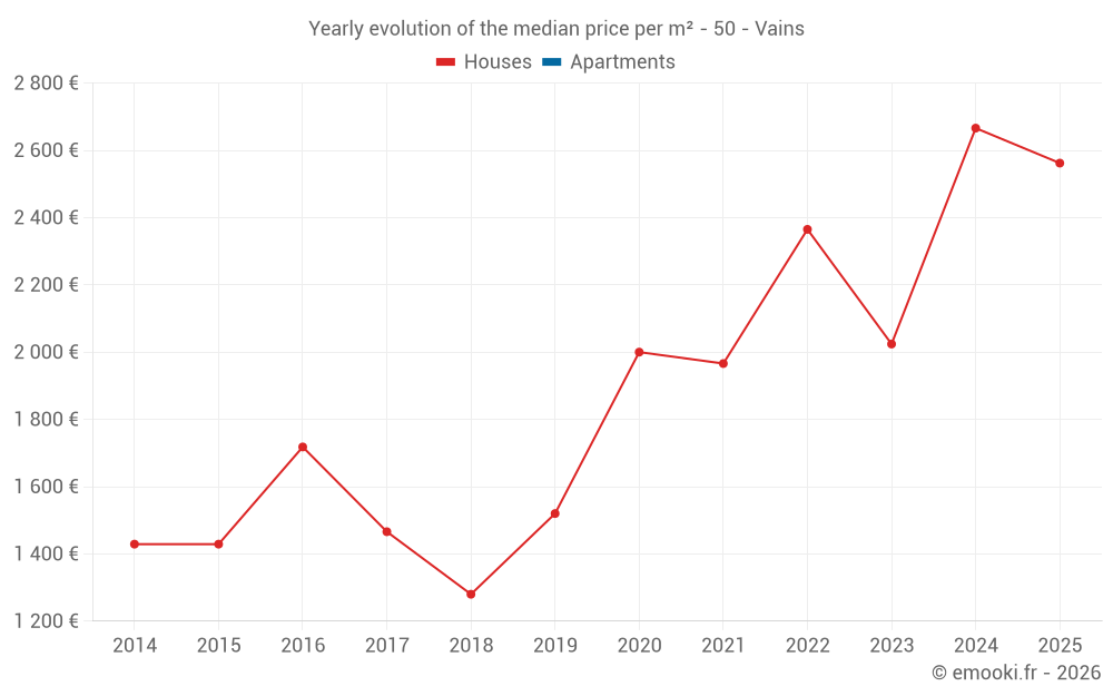 The median price on the 19 house transactions of the last 24 months in the municipality of Vains was 2 368 € per square meter for a median property value of 276 000 €. Over this period, 60% of transactions were between 1 716 and 2 779 € per square meter (from the 2nd to the 8th deciles).