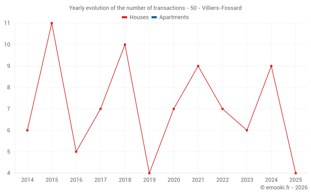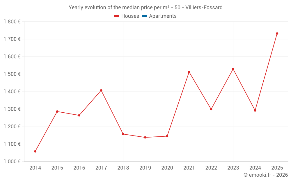 The median price on the 14 house transactions of the last 24 months in the municipality of Villiers-Fossard was 1 360 € per square meter for a median property value of 158 000 €. Over this period, 60% of transactions were between 1 027 and 1 873 € per square meter (from the 2nd to the 8th deciles).
