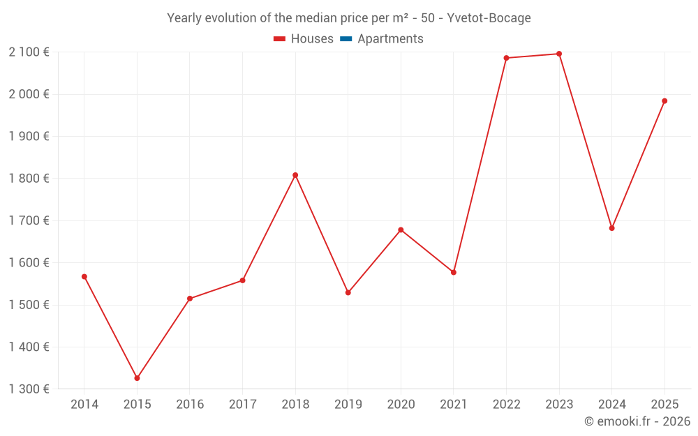 The median price on the 17 house transactions of the last 24 months in the municipality of Yvetot-Bocage was 1 974 € per square meter for a median property value of 220 000 €. Over this period, 60% of transactions were between 1 707 and 2 321 € per square meter (from the 2nd to the 8th deciles).