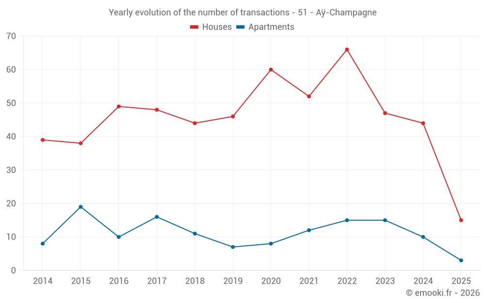 The median price on the 44 house transactions of the last 12 months in the municipality of Aÿ-Champagne was 1 926 € per square meter for a median property value of 210 000 €. Over this period, 60% of transactions were between 1 360 and 2 360 € per square meter (from the 2nd to the 8th deciles).