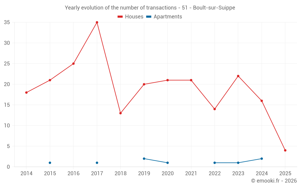The median price on the 34 house transactions of the last 24 months in the municipality of Boult-sur-Suippe was 2 276 € per square meter for a median property value of 241 000 €. Over this period, 60% of transactions were between 1 758 and 2 865 € per square meter (from the 2nd to the 8th deciles).