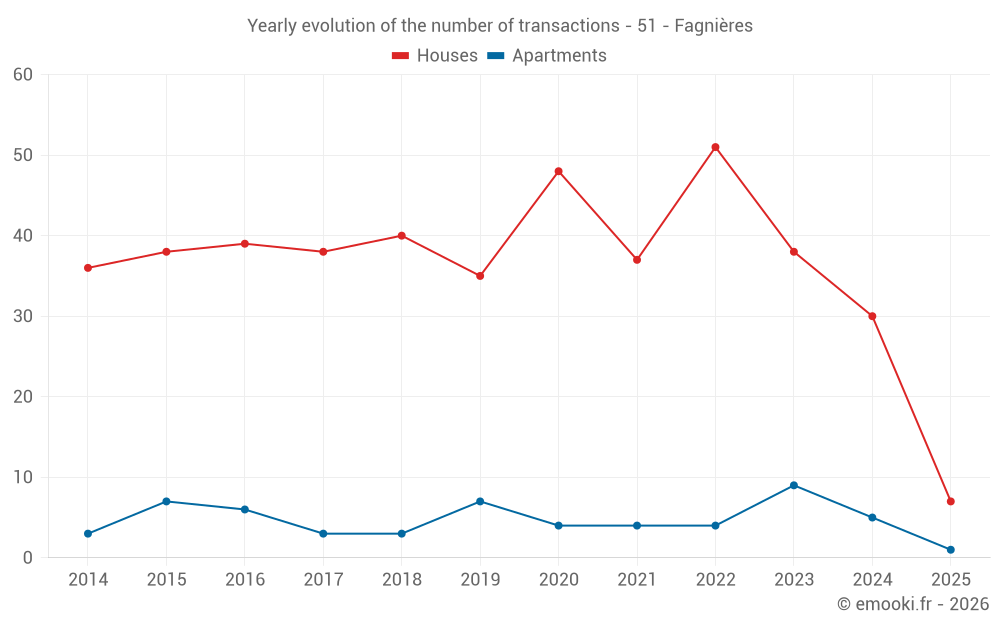 The median price on the 24 house transactions of the last 12 months in the municipality of Fagnières was 1 834 € per square meter for a median property value of 179 500 €. Over this period, 60% of transactions were between 1 590 and 2 127 € per square meter (from the 2nd to the 8th deciles).
