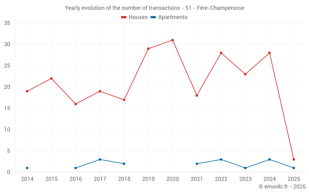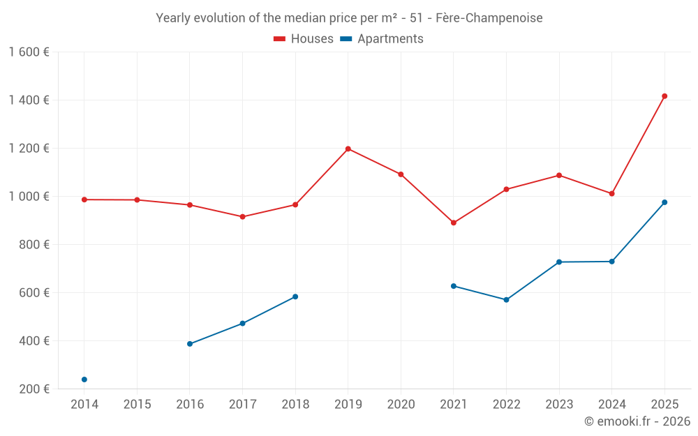 The median price on the 40 house transactions of the last 24 months in the municipality of Fère-Champenoise was 1 082 € per square meter for a median property value of 92 500 €. Over this period, 60% of transactions were between 781 and 1 369 € per square meter (from the 2nd to the 8th deciles).